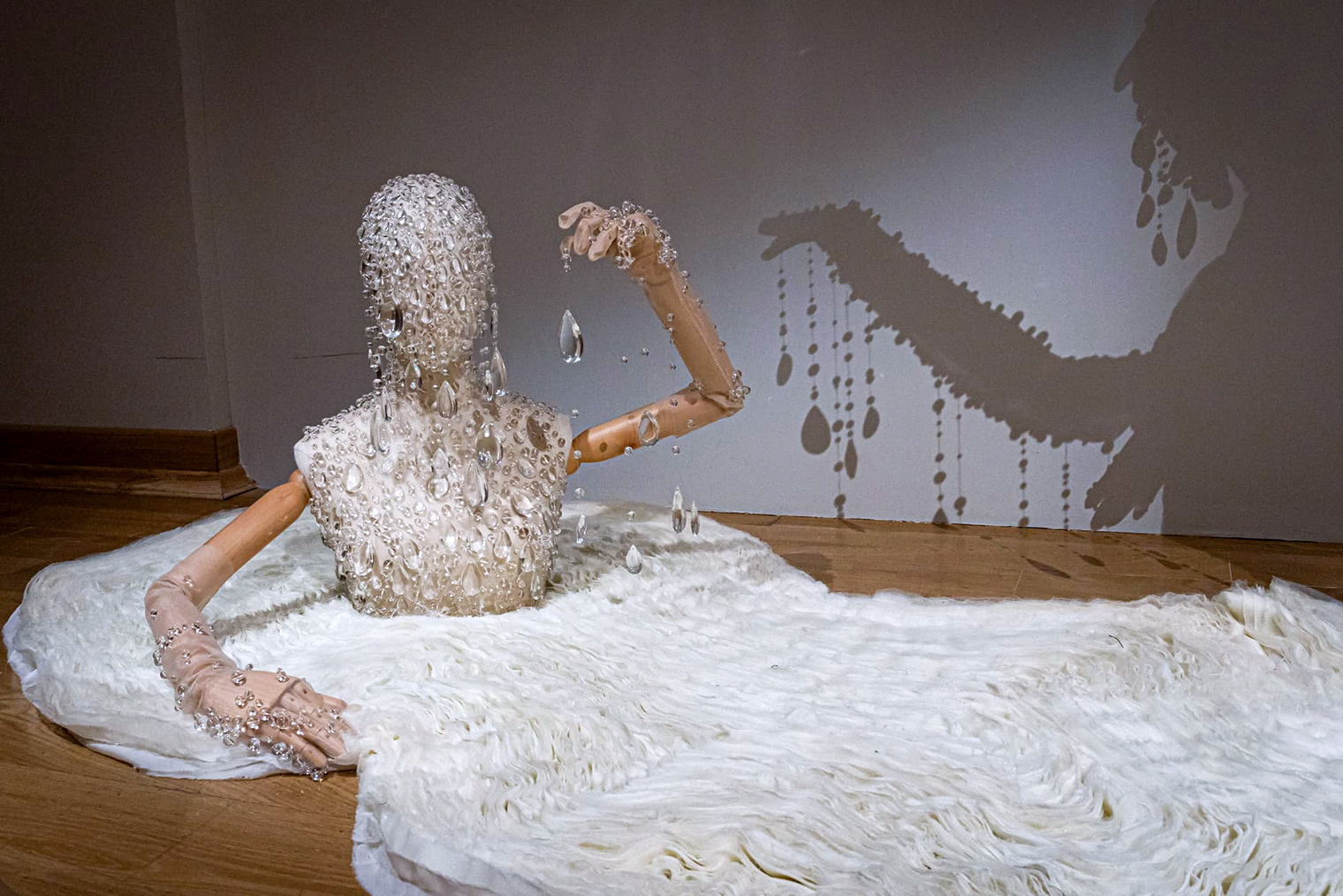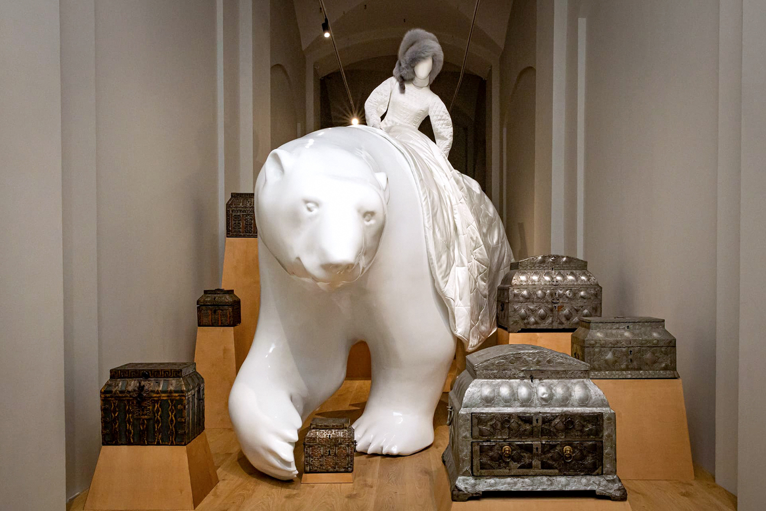 На выставке показывают эксклюзивные костюмы Алены Ахмадуллиной, сказочные образы «древнего русского мира» и старинные предметы из музейной коллекции. Центральным объектом экспозиции стало платье «Божественная Майя» из собрания Государственного Эрмитажа, созданное дизайнером в 2015 году в память о балерине Майе Плисецкой. Второй важный экспонат — кутюрное платье из материала тайвек, выполненное Ахмадуллиной в 2025 году ко Дню Земли.
