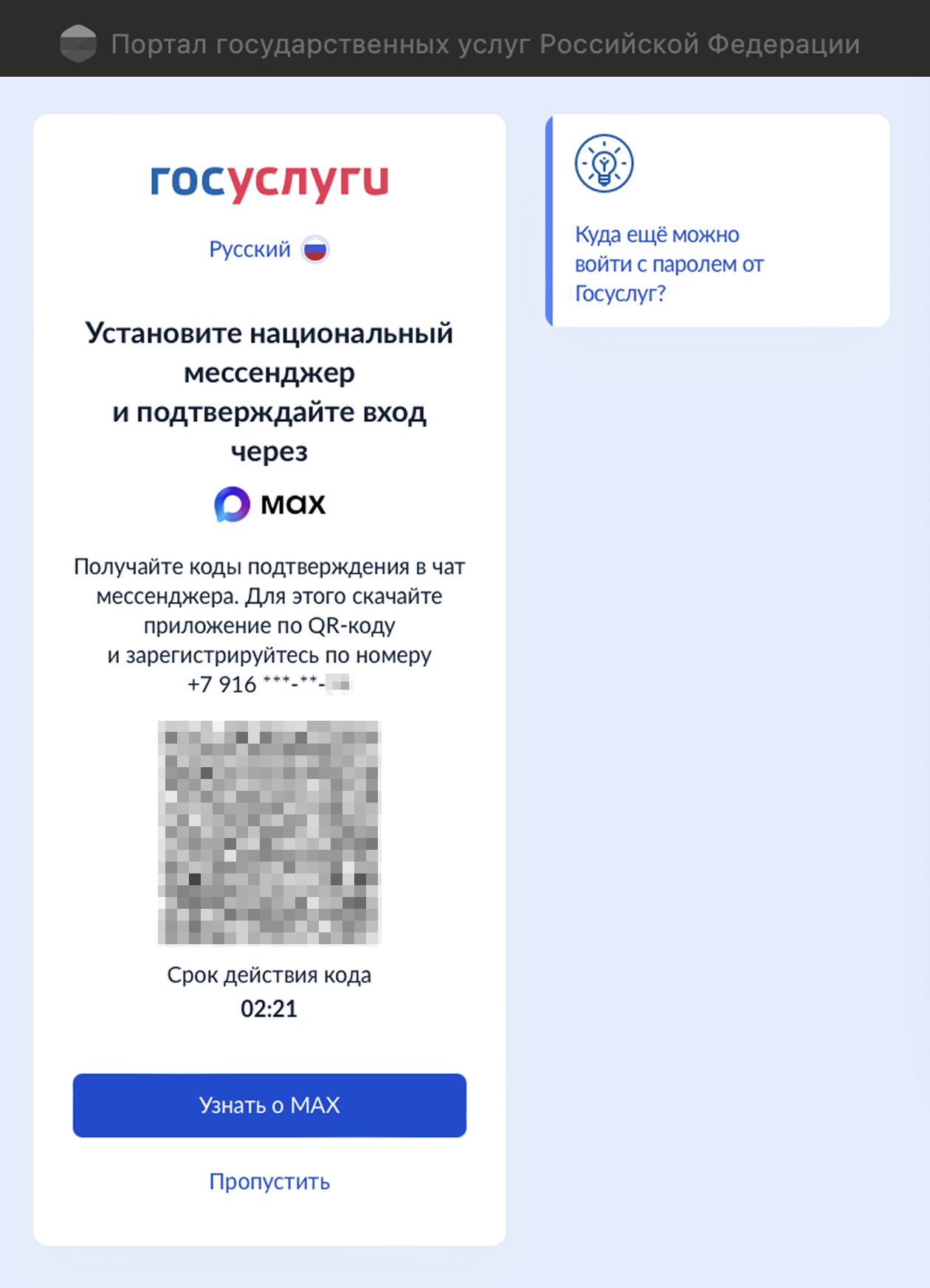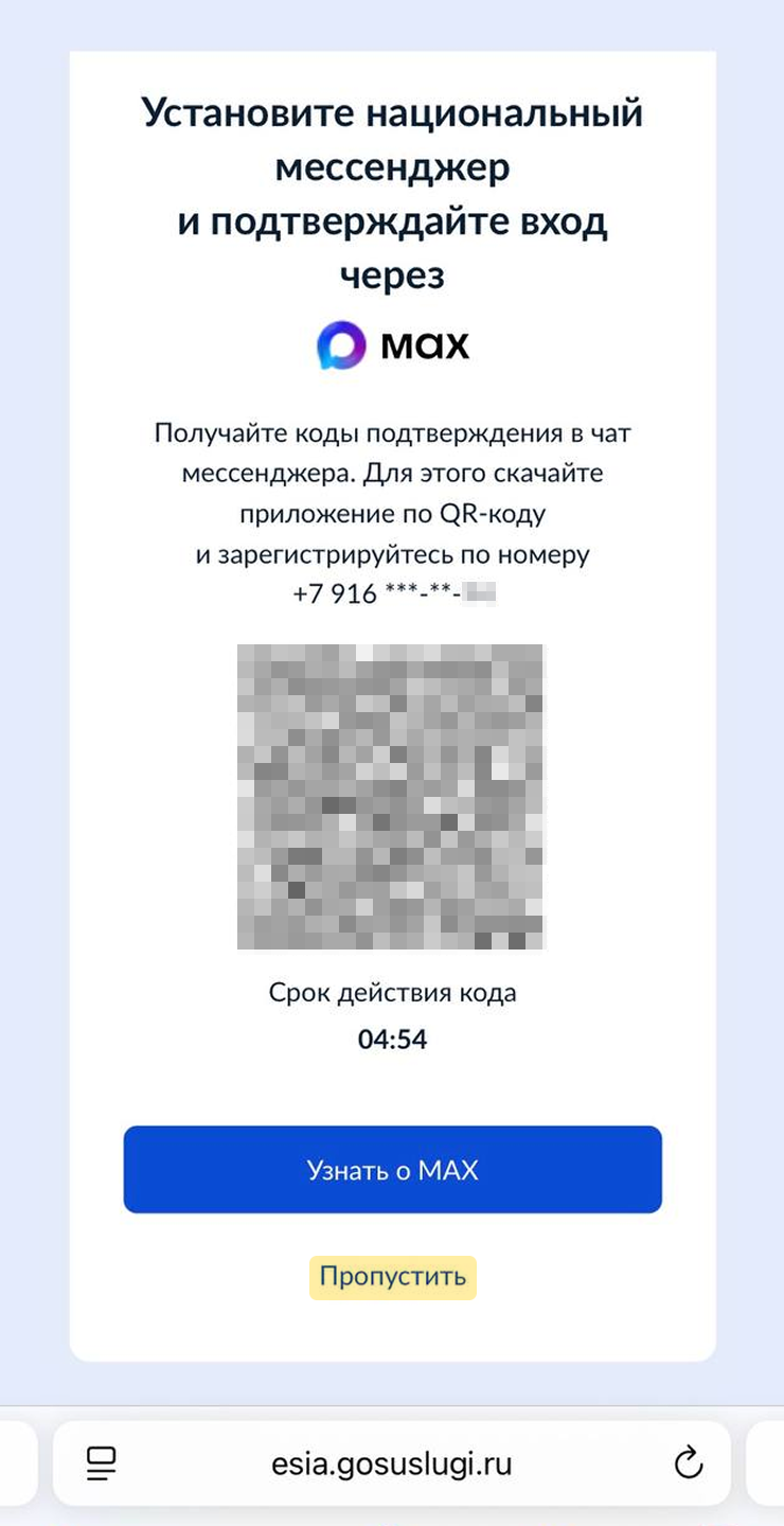 При входе на госуслуги с компьютеров кнопка «Пропустить» на странице с предложением установить Max осталась. Также сохранилась возможность войти путем сканирования