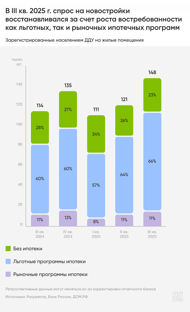 - Люди стали чаще брать ипотеку. В общей структуре продаж новостроек доля ипотеки в третьем квартале 2025 года достигла 77% — это