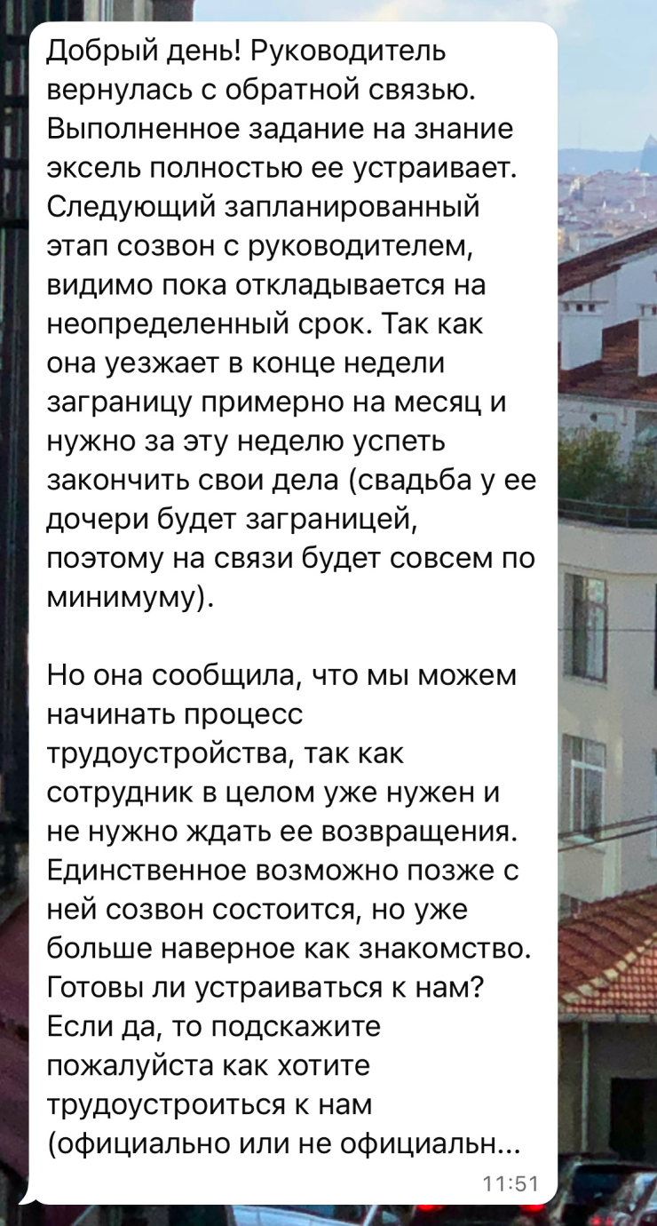 На отклик мне прислали простое тестовое задание в «Экселе» — собрать и проанализировать пару таблиц. После выполнения получила странное сообщение, что тестовое ок, надо было бы пройти собеседование, но руководитель укатила на свадьбу, поэтому можно приступать к работе без собеседования. Это странно, но эйфория от быстрого трудоустройства заглушила голос разума.
