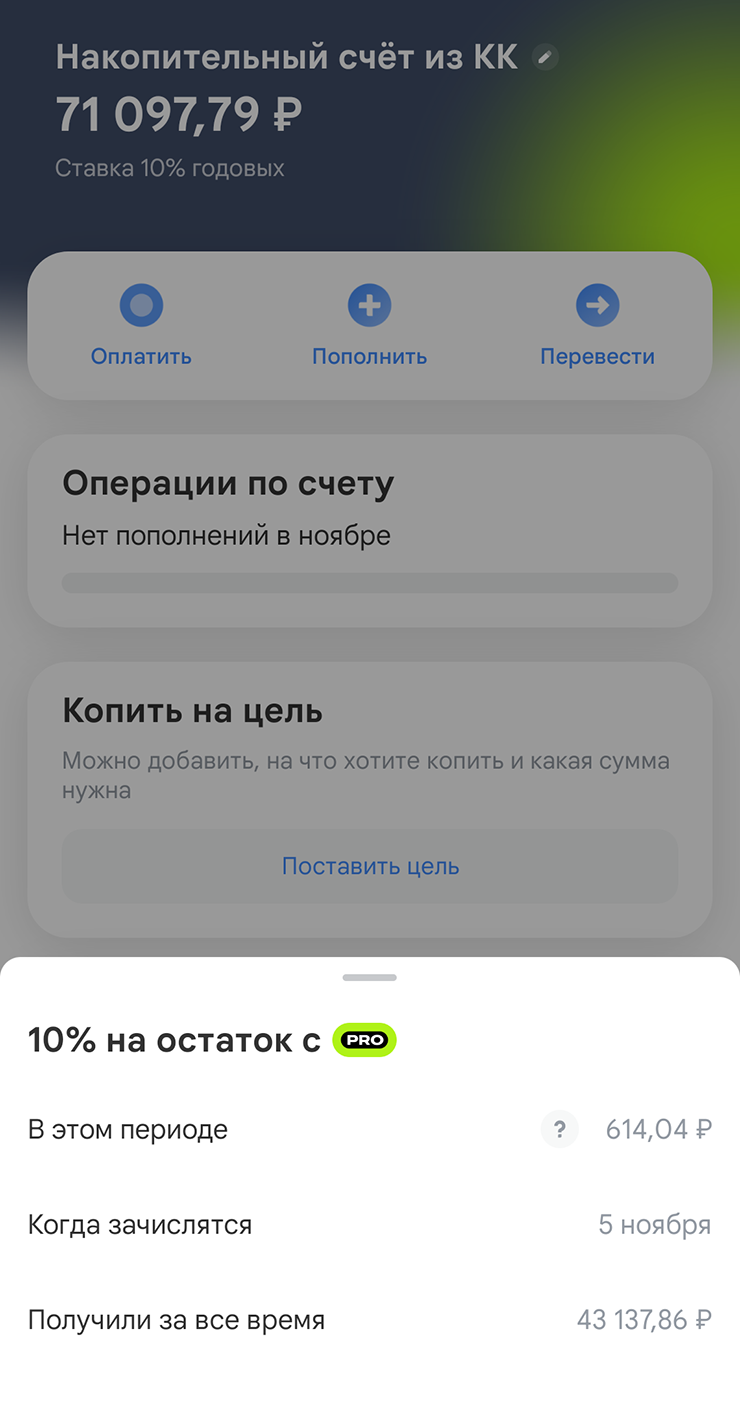 Закидывать кредитные 50 000 ₽ на трехмесячный вклад не имело смысла: были доступны либо непополняемые вклады, либо те, что можно пополнить только в первый месяц. Поэтому я ежемесячно переводил деньги на накопительный счет с начислением процентов на минимальный остаток за месяц. Ставка тогда была
