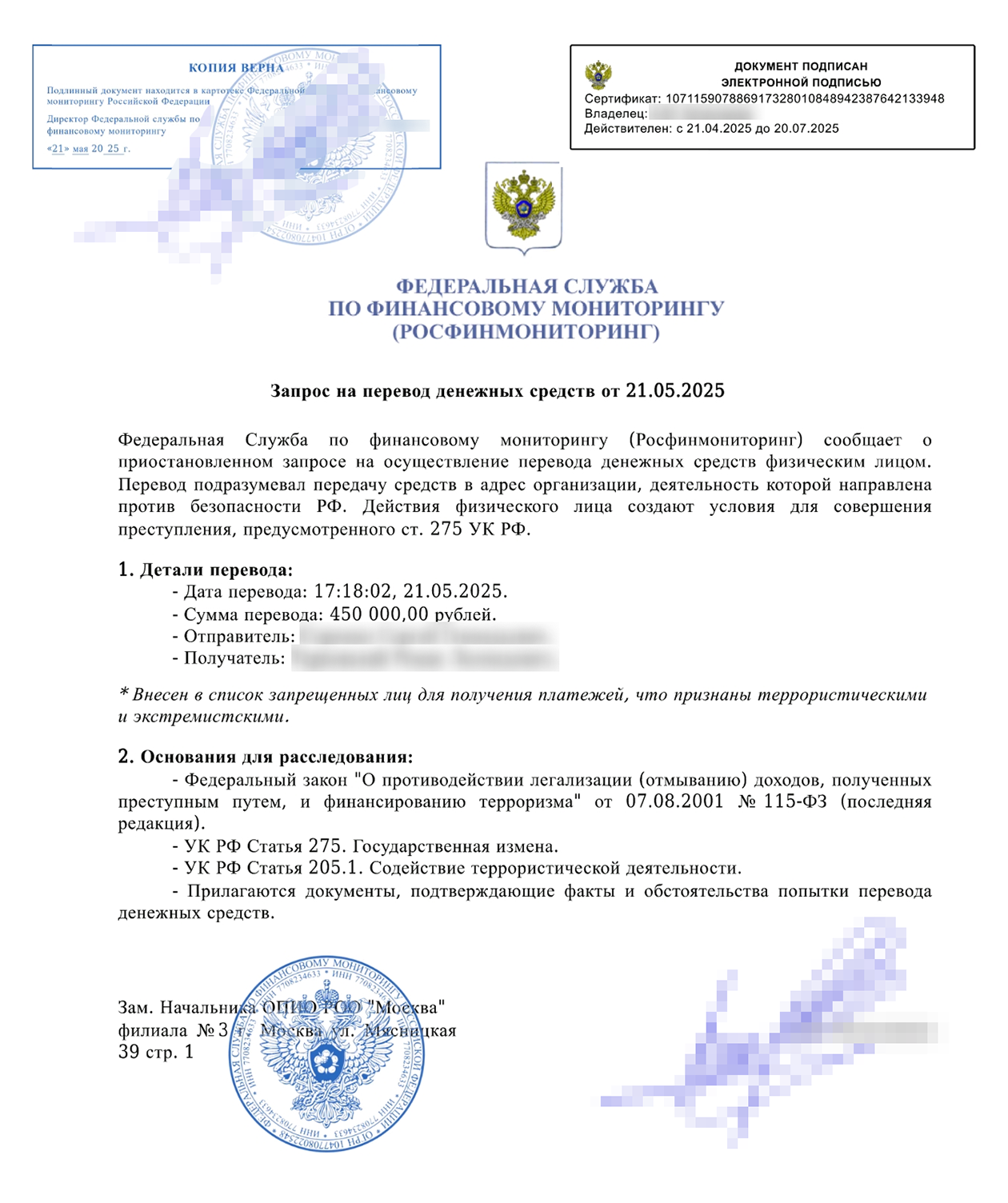 Вас пугают, что ваши деньги тоже в опасности: якобы третьи лица получили доступ и к счетам всех клиентов. Росфинмониторинг уже приостановил несколько подозрительных транзакций.