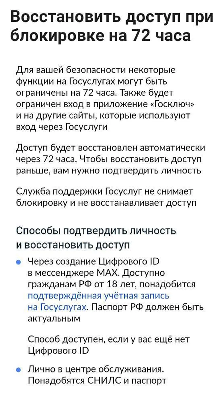 В сообщении говорится, что ограничения будут автоматически сняты через 72 часа, а чтобы восстановить доступ раньше, нужно подтвердить личность. Предлагается два способа сделать это: лично обратиться в МФЦ или создать «Цифровой ID» в мессенджере Max.