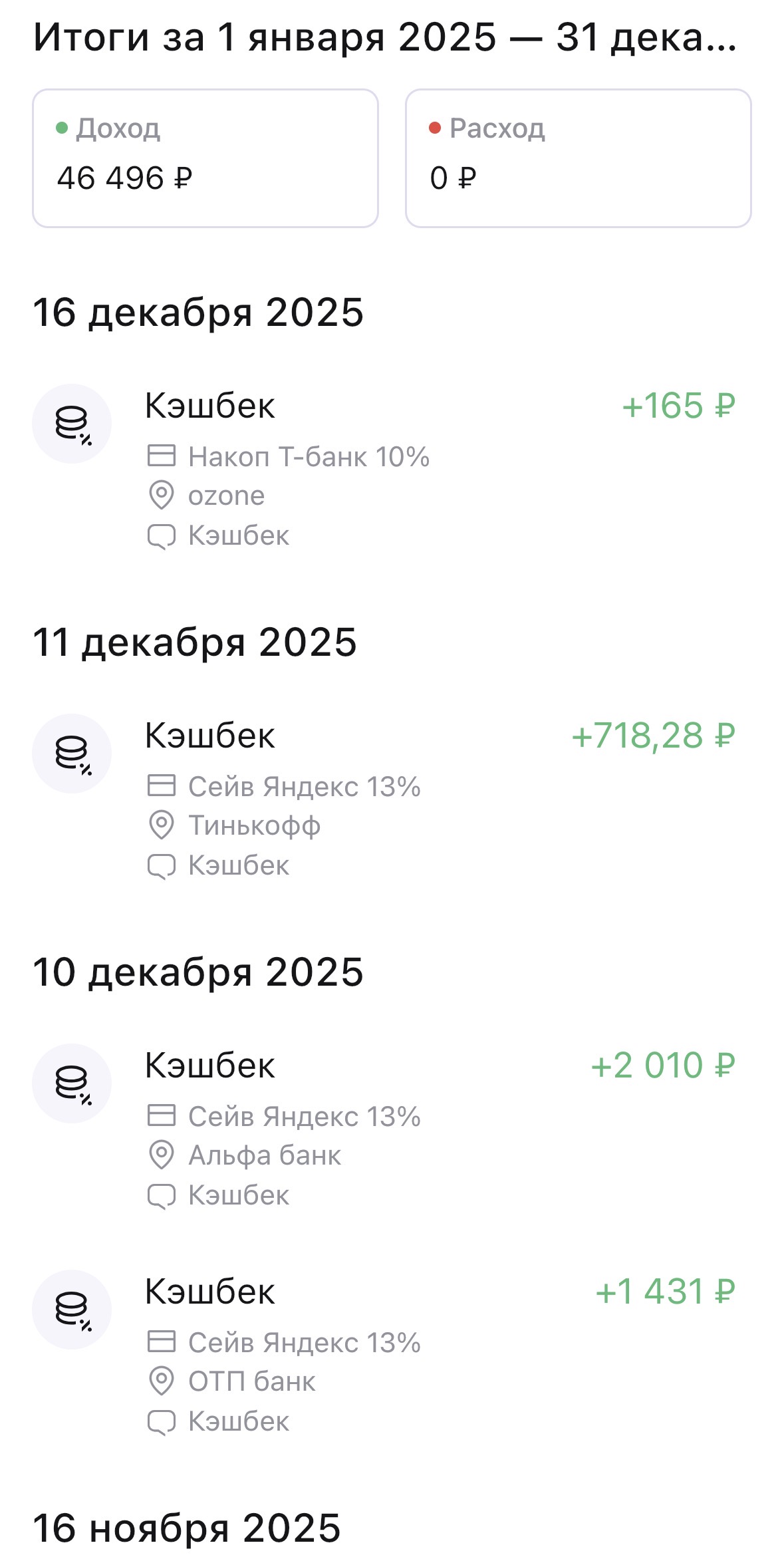 За 2025 год по всем картам мне вернули 46 496 ₽ — тут не учтены бонусы, которые предлагают некоторые банки, только реальные деньги, один раз в месяц падающие на счет. В среднем удается возвращать по 3000-4000 ₽ в месяц. Чтобы выбрать непересекающиеся категории кэшбека, нужно полчаса один раз в месяц. Но чтобы покупать товары по нужным картам, нужна постоянная осознанность: заметка в телефоне со всеми категориями, а ещё хороший интернет для переводов по СБП между банками самому себе. Если магазин находится в подвале или есть проблемы с сетью, то оплатить с нужной карты не всегда удается. Либо надо переводить деньги заранее.