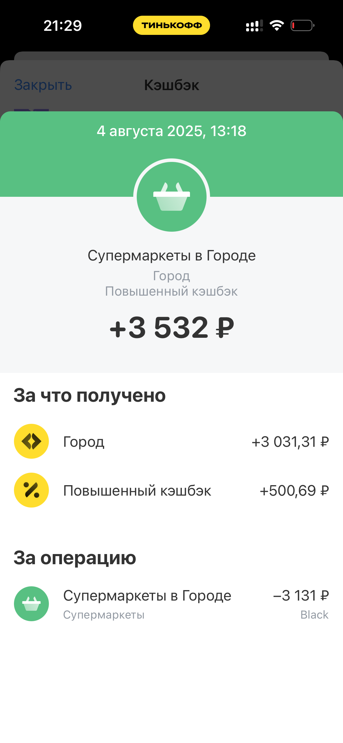 Мой самый удивительный кэшбек случился в августе 2025 года: за покупку в супермаркете в Городе Т-Банка в размере 3131 ₽ мне вернули больше фактической траты — 3532 ₽. Так вышло, видимо, потому что суммировался кэшбек в выбранной категории на месяц и кэшбек по промокоду на первый заказ в Городе — о нем я узнала из telegram-каналов. Моему счастью не было предела: заказала разной заморозки во Вкусвилле к мужу на работу, потому что понимала, что промокод сейчас отключат и действовать надо быстро. За год такой случай был всего один, но тот потребительский азарт я чувствую до сих пор.