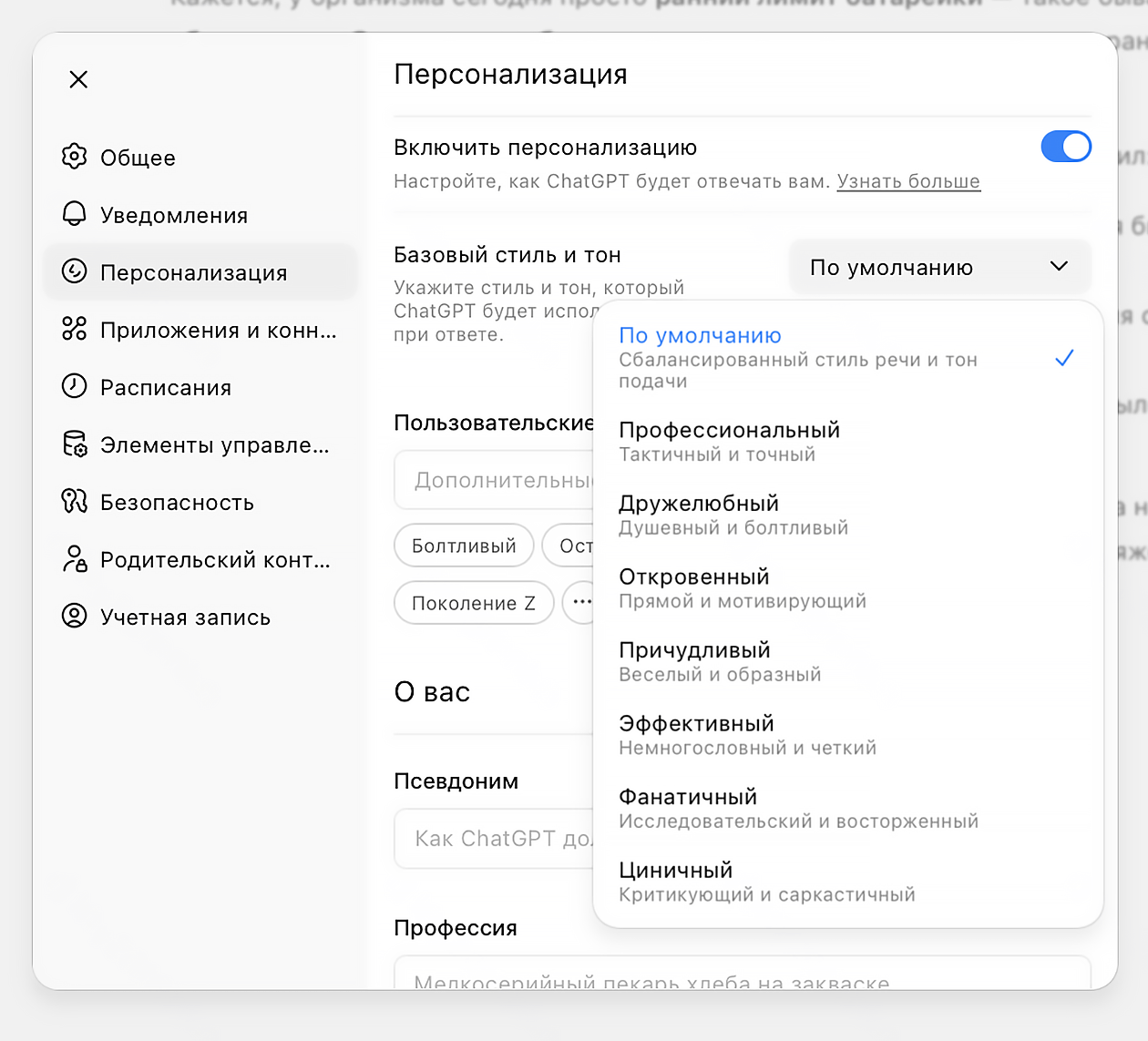 OpenAI также обновила настройки стиля и тона ответов нейросети в разделе персонализации. К вариантам «По умолчанию», «Дружелюбный», «Эффективный», «Циничный» и «Фанатичный» добавили «Профессиональный», «Откровенный» и «Причудливый».