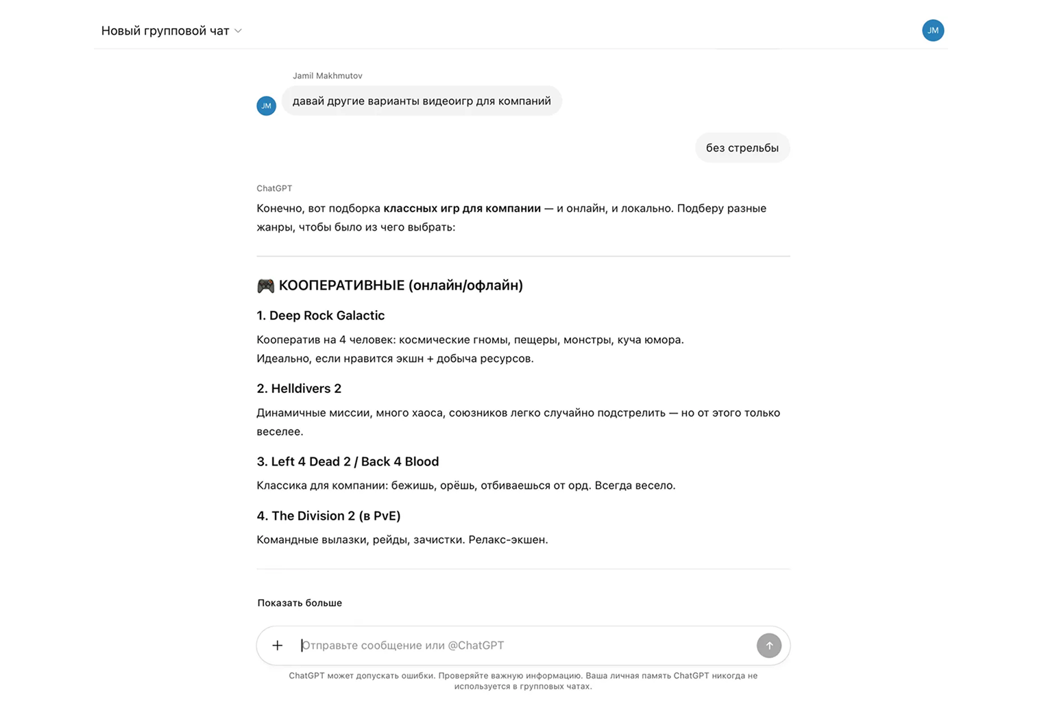 Групповые чаты отделены от обычных бесед с ChatGPT и не используют личную память. И наоборот: информация из групповых чатов не создает у модели новых воспоминаний для работы в личных запросах.