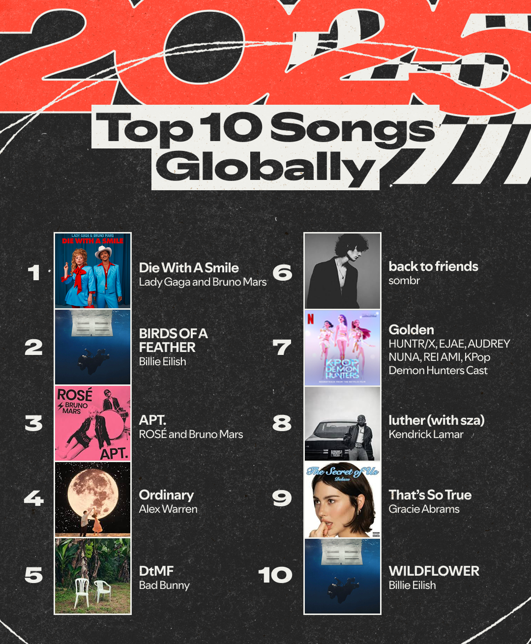 Среди песен первое место взяла Die With A Smile Леди Гаги и Бруно Марса. Следом расположились Birds of a Feather Билли Айлиш и APT. Розэ и Бруно Марса.