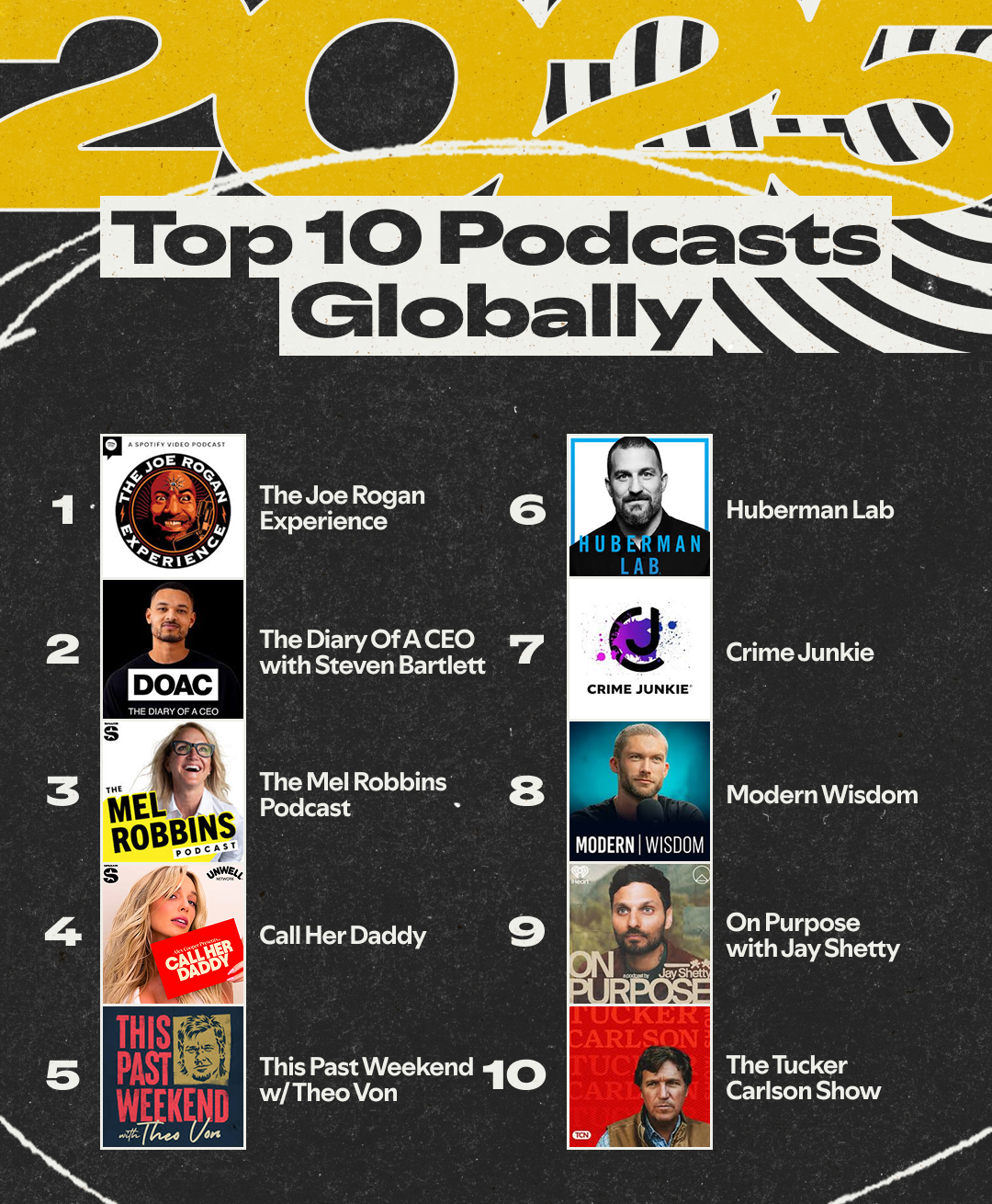 Самым популярным подкастом шесть лет подряд остается The Joe Rogan Experience Джо Рогана. В
