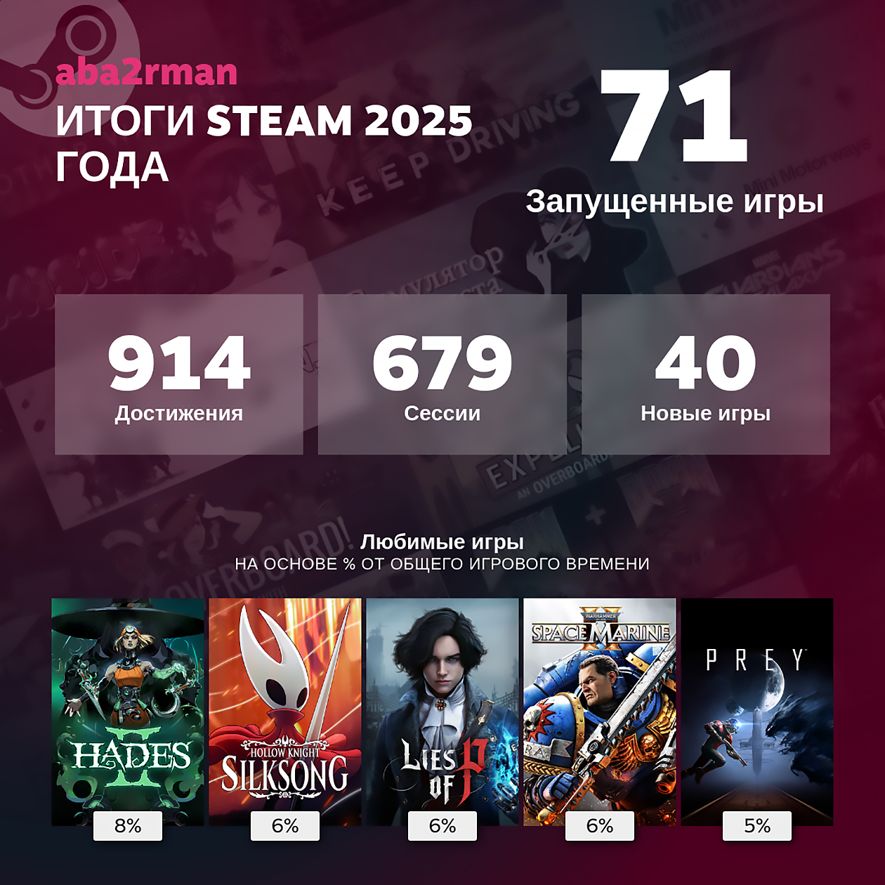 Итоги года в Steam оформлены в виде карточек с различной статистикой о ваших игровых достижениях. Вот некоторые из них.